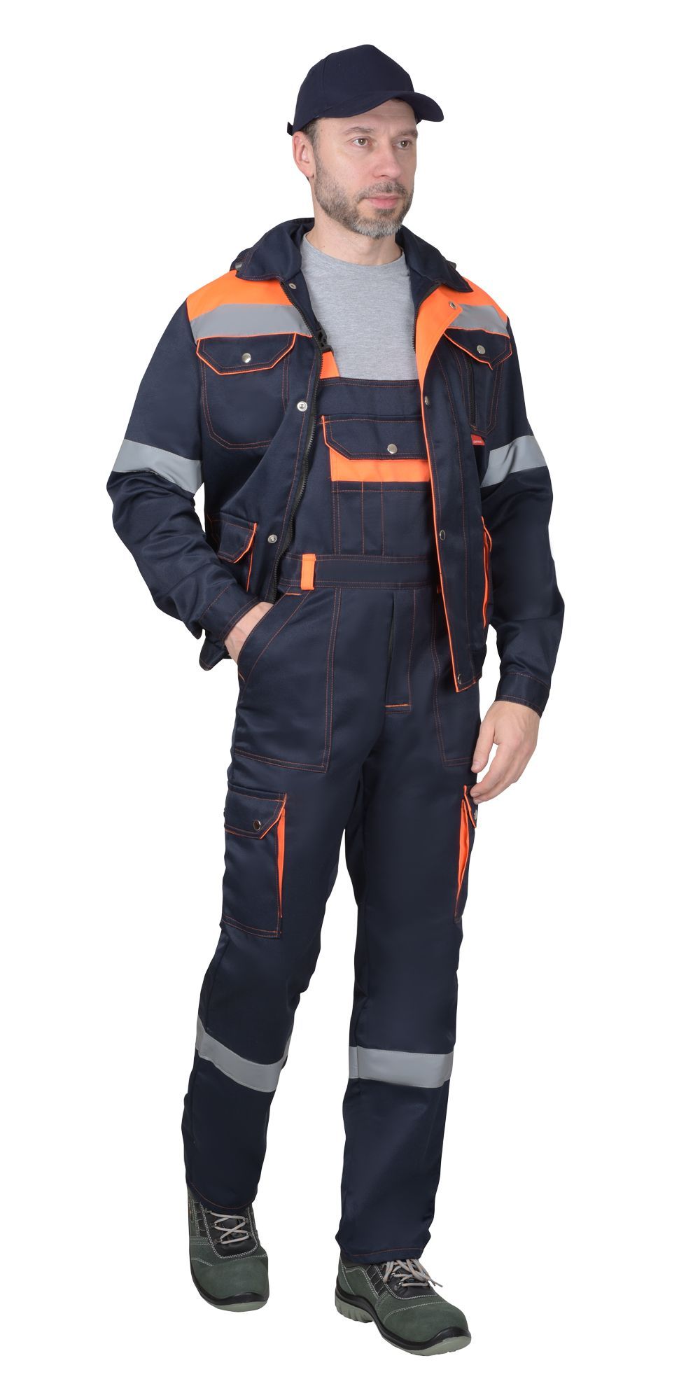 Мужской костюм включает куртку и полукомбинезон. Отделка светло-серая на куртке – на кокетке переда; нижний срез кокетки – с красным кантом. Красные вставки на планке, на нагрудном кармане и рядом с манжетами рукавов, на передних карманах брючин. На куртке потайная застёжка-молния. Отложной воротник. На спинке вертикальные складки, регулировка низа на хлястиках-липучках. Карманы: в вертикальных швах и накладные на груди, с отстрочками (один с клапаном). Полукомбинезон регулируется резинкой на талии. Лямки с регулировкой на карабинах и резинке. Карманы: один на грудке, с клапаном и отстрочкой, пара боковых (вход фигурный), два задних для инструмента. Брючины снабжены наколенниками.