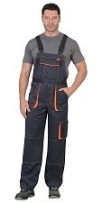 Мужской полукомбинезон. Декоративная двойная строчка контрастного цвета. Отделка контрастная на карманах и клапанах. Застёжка – молния спереди и пуговичная боковая. Регулировка спинки – частичная стяжка. Регулировка лямок – с помощью карабинов. Имеются пять накладных карманов: один на грудке, с клапаном и отстрочкой под инструмент, два больших объёмных боковых с косым входом, один сзади, один на брючине (клапан и отстрочка). Брючины оснащены наколенниками.