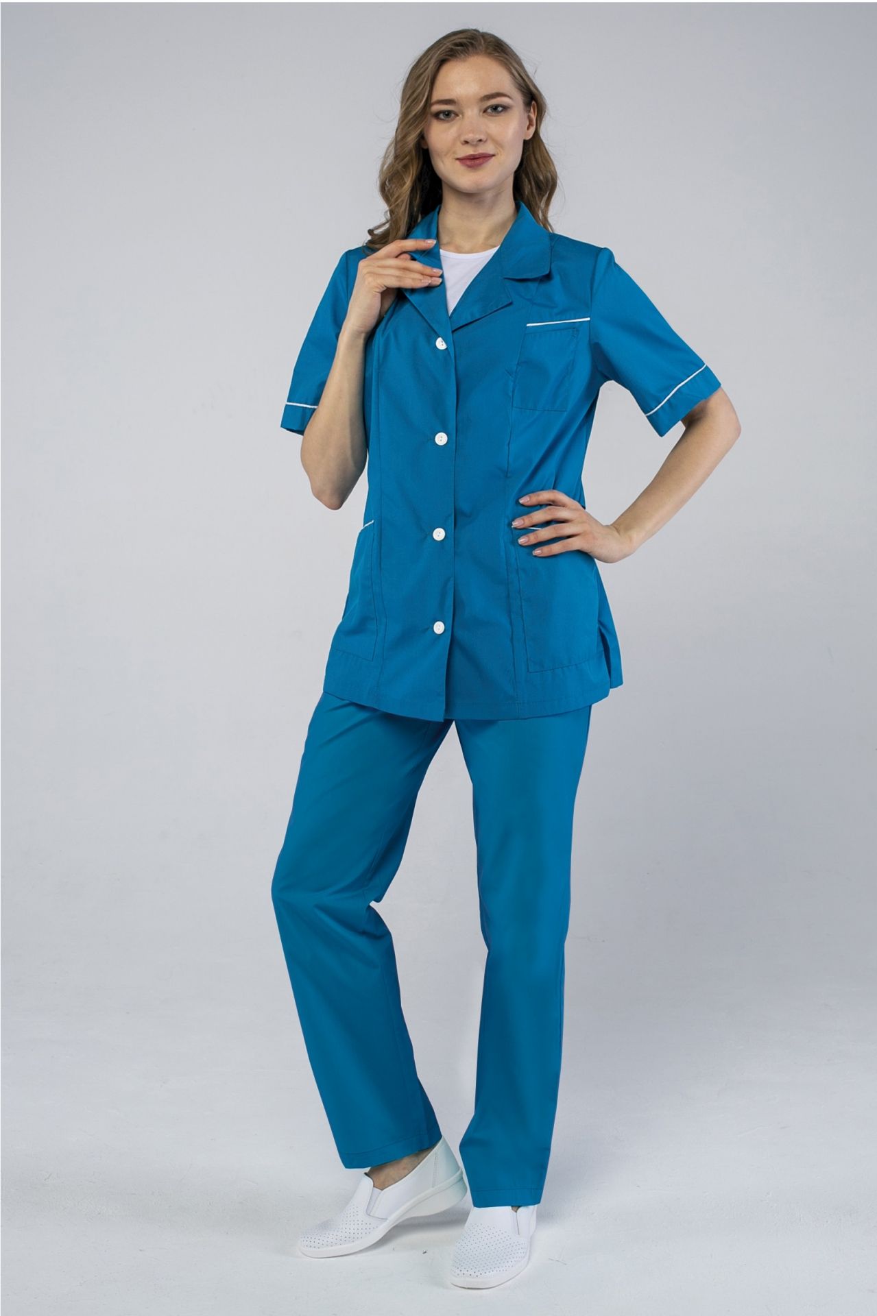 Костюм повара женский "Гастроном" белый/василек